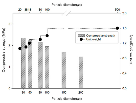 Figure 7 shows the unit weight and compressive strength according to the particle size of porous feldspar. The unit weight decreased as the particle size of the feldspar decreased. The unit weight for the particle size of 20 µm was 1.06 g/cm3, which was approximately 31% lower than that for 500 µm. As for the compressive strength according to the particle size, the lowest strength was observed for the largest particle size of 200 µm. As the particle size decreased, the strength slowly increased up to approximately 90%, confirming that the physical characteristics were improved by reducing the particle size through mechanical activation.