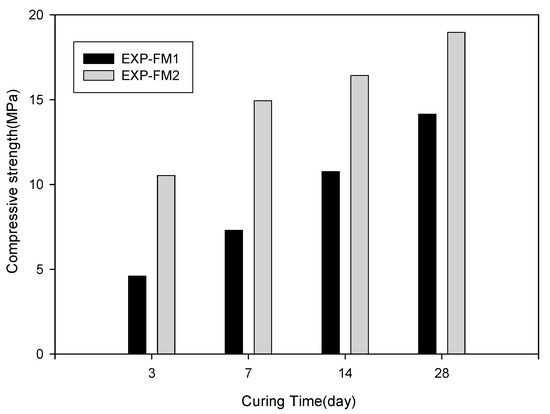 Figure 10 shows the results of the compressive strength test. As for the strength characteristics according to the curing time, the strength showed a tendency to increase over time for both materials. Especially, for EXP-FM2 with porous feldspar, the compressive strength at 3 days was 10.53 MPa even though the cement content was reduced by 5%. This result indicates that the strength was improved by approximately 43% compared with that of EXP-FM1. The compressive strengths of EXP-FM1 and EXP-FM2 at seven days were 7.3 and 14.94 MPa, respectively, showing that the strength of EXP-FM2 was two times higher. Both compressive strengths satisfied the quality criterion of South Korea (strength at seven days: 7 MPa) [31]. The compressive strengths of EXP-FM1 and EXP-FM2 at 28 days were 14.14 and 18.97 MPa, respectively, confirming that the strength of EXP-FM2 with porous feldspar was approximately 35% higher than that of EXP-FM1 even though its strength increment slightly decreased.