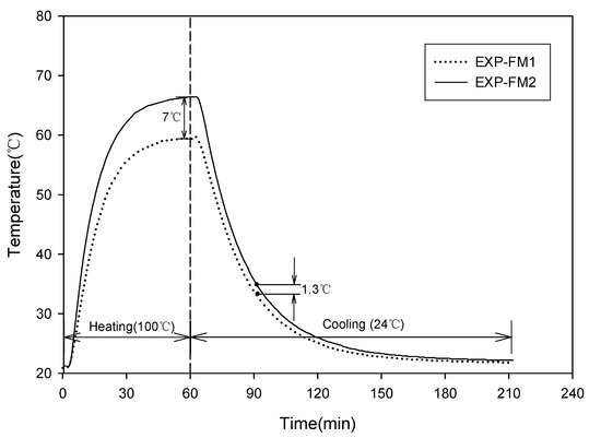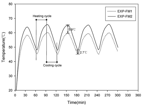 Figure 12 shows the results of the test in which the heating and cooling periods were repeated at 30 min intervals. The maximum temperatures during the heating period were approximately 59 °C for EXP-FM1 and 65 °C for EXP-FM2, resulting in a difference of approximately 6 °C. Contrarily, the minimum temperatures during the cooling period were approximately 45 °C for EXP- FM1 and 48 °C for EXP-FM2, resulting in a difference of approximately 3 °C. As the test was repeated, the maximum and minimum temperatures exhibited similar values.