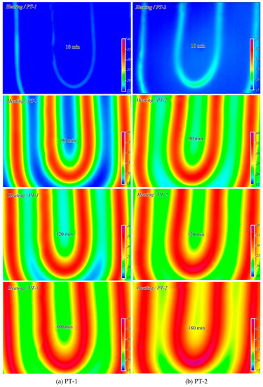 Figure 13 shows the temperature distribution of the heat storage layer measured using the thermal-imaging camera during the heating time after hot water was supplied to the floor. The temperature of the supplied hot water was 55 °C. At 10 min after the boiler operation, the heat storage layer mixed with porous feldspar (PT-2) exhibited a temperature approximately 2 °C higher than that of the heat storage layer composed of ordinary concrete (PT-1). The temperature difference increased to approximately 3 °C at 2 h after the boiler operation, indicating that PT-2 had better heat transfer than that of PT-1. Figure 14 shows the temperature variation during the cooling period after the boiler operation was stopped. PT-1 exhibited a fast cooling speed and no thermal image could be obtained after 90 min. The average temperature was 21 °C after 120 min and 18 °C after 180 min, which was identical to the temperature before the boiler operation. In contrast, PT-2 with porous feldspar exhibited temperatures approximately 2 °C higher than those of PT-1. The temperature remained at over 23 °C even after 180 min of cooling, confirming the excellent heat storage characteristics.