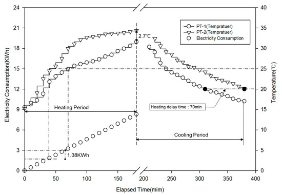 Figure 15 shows the heat storage layer temperature and power consumption during the experiment period under the two conditions. PT-2 exhibited a higher temperature increase rate than that of PT-1 until 100 min after heating, and the increase rate decreased after 30 °C. PT-1 showed a temperature increase rate similar to that of PT-2 until 20 °C, but its temperature increase rate became lower than that of PT-2. During 180 min of heating, the maximum temperature was 34.4 °C for PT-2 and 31.6 °C for PT-1, showing that the value for PT-2, which used porous feldspar, was 2.7 °C higher. When the target temperature of the heat storage layer was set to 25 °C, the boiler operation was stopped after approximately 40 min and the power consumption was 1.84 kWh for PT-2. For PT-1, the boiler operation was stopped after approximately 70 min and the power consumption was 3.22 kWh. In other words, the boiler was operated 30 min longer for PT-1 than for PT-2, and PT-1 required the additional power of 1.38 kWh, confirming that PT-2 could save approximately 57% power. If the boiler restart temperature is set to 20 °C after the cooling process, it is expected that the boiler will restart after 380 min for PT-2 and after 310 min for PT-1; thus, PT-2 will delay the boiler operation by approximately 70 min. Through the experiment, the rapid temperature increase effect in the heating process owing to the high thermal conductivity caused by the specific surface area characteristics of porous feldspar and the energy-saving effect in the cooling process owing to the delay effect caused by the heat storage characteristics of porous feldspar could be confirmed.