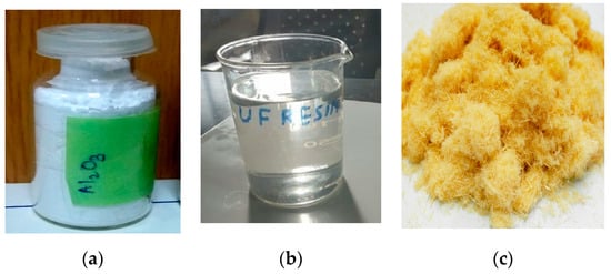The nanofillers were synthesized by weighing 195 g of urea-formaldehyde resin and 3, 6, and 9 g of alumina nanoparticles of dry weight of fibers. Hence, in the four samples, the percentages Al2O3 in urea-formaldehyde resin are 0%, 1.54%, 3.08%, and 4.61%. The resin was then sonicated with Ultrasonic Processor UP 400S (Hielscher USA, Inc., Wanaque, NJ, USA) for 25 min. The samples were represented by Al1, Al2, Al3 and Al4 according to the concentration of alumina. The alumina nanoparticles, urea-formaldehyde resin, and natural fibers of Populus Deltuidess and Euamericana are depicted in Figure 1.