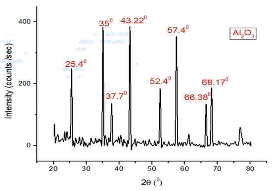 X-ray diffraction analysis (Malvern Panalytical Ltd., Malvern, UK) of alumina nanoparticles was investigated. It was found that alumina shows peaks at 25.4°, 35°, 37.7°, 43.22°, 52.4°, 57.4°, 66.38°, and 68.170° as can be seen in Figure 3. The peak at 2θ equal to 35°, 43.22°, and 57.4° obtained for this sample are the strongest that can be compared with the peaks at 25.4°, 37.7°, 52.4°, 66.38°, and 68.17°.