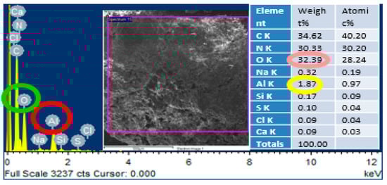 The microstructural analysis and scanning electron microscopy of Al2O3-UF was conducted for the purpose to examine the role of nanoparticles in the resin. Figure 4 illustrates the scanning electron microscopy images of the urea-formaldehyde resin after curing. An uneven configuration of the resin was found in the cross-linkage. The scanning electron microscopic results clearly identified the partial pits in the urea-formaldehyde resin covered by 3% alumina nanoparticles. Due to robust bonding, minor cracks in the urea-formaldehyde resin were also covered by alumina nanoparticles and hence, an increase in the overall strength of the desired medium density fiberboard has been observed [30]. The bright region in the scanning electron microscopy shows the presence of alumina nanoparticles and the dark region depicts urea-formaldehyde resin. The result was confirmed by Energy Dispersive X-ray Spectroscopy (EDS).