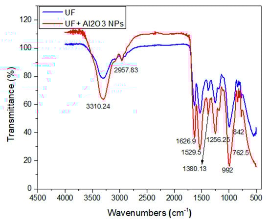 Fourier transform infrared spectroscopy of urea-formaldehyde with or without alumina nanoparticles.