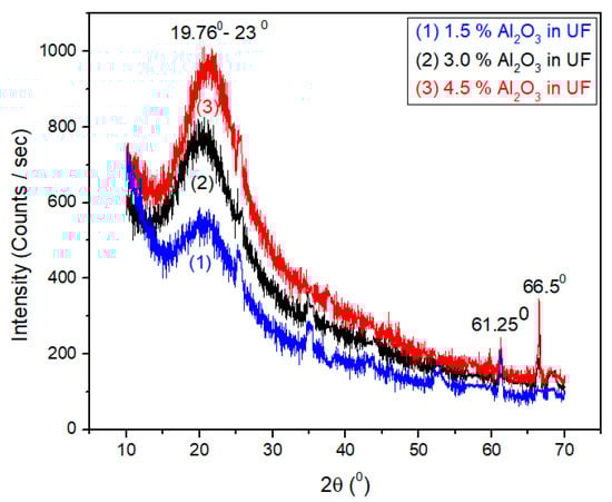 The X-ray diffraction patterns of urea-formaldehyde resin with 1.5%, 3%, and 4.5% concentration of alumina nanoparticles are shown in Figure 6. The resin was cured at 100 °C before X-ray diffraction. Samples 1, 2, and 3 containing 1.5%, 3%, and 4.5%, Al2O3 respectively show a peak at 20.6°, 61.25°, and 66.5° with d-spacing of 0.43 nm, 0.151 nm, and 0.141 nm, respectively according to Brag’s Law by using Equation (9).