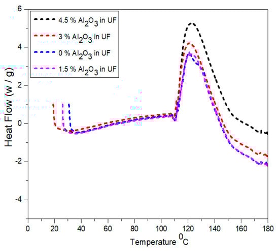 Figure 9 represents the temperature ranges versus heat flow curves for the selected four samples containing urea-formaldehyde and alumina urea-formaldehyde resin. The curves indicate that with the addition of different concentrations of alumina nanoparticles, the curing temperature decreases. The total heat content increases with the concentartion of alumina nanoparticles. The peak at 120 °C in 1.5% alumina is formed due to formation of bonding in urea-formaldehyde at the interface. The alumina nanoparticles has adopted an effect analogous to former thermosetting resin. As studied in literature, alumina nanoparticles delivered Lewis acidity. Because of the presence of hydoxyl groups in alumina nanoparticles, the superficial behaved as a catalytic agent and polymerized the urea-formadehyde resin as reported by Kumar et al. [33].