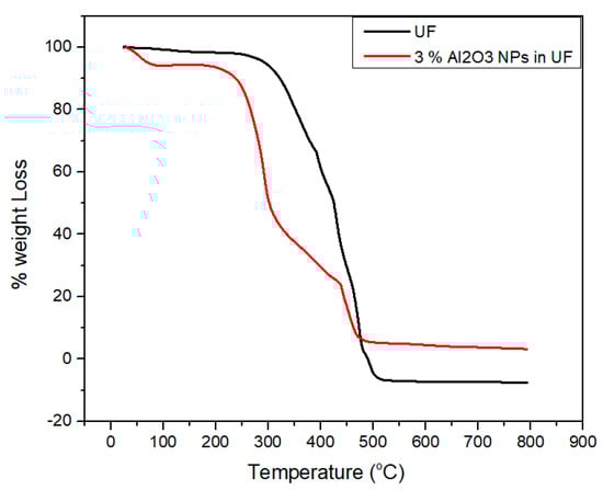 Thermo-gravimetric analysis of urea-formaldehyde resin with and without alumina nanoparticles.