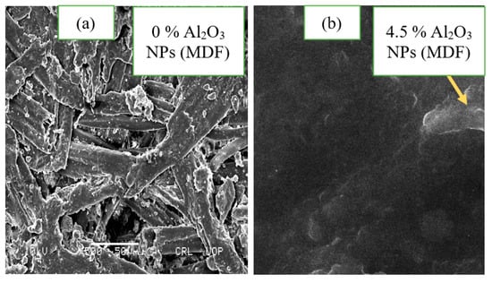 The final medium density fiberboard with and without alumina nanoparticles is shown in Figure 11. Scanning electron microscopy reveals the cluster structure due to alumina nanoparticles using sodium montmorillonite nanoclay [35]. Visible voids were observed in the final medium density fiberboard made of pure urea-formaldehyde resin. These voids were covered by alumina nanoparticles because of the discrete and head-to-head regions.