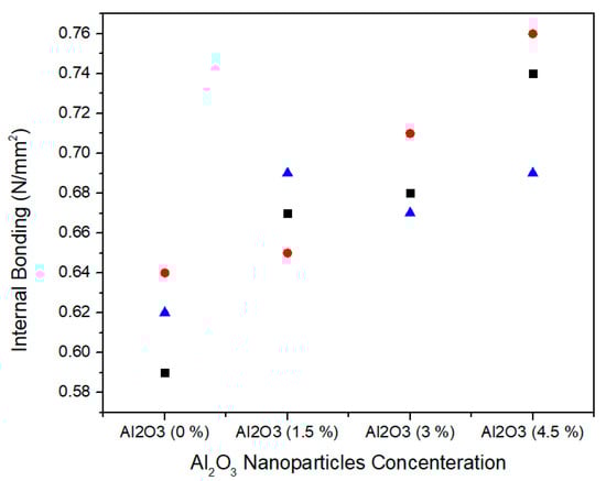 The reason of linear relationship between internal bonding and alumina nanofillers is due to increase in the cross-link density of urea-formaldehyde resin. Further, alumina nanoparticles also have the capability of high heat transfer which leads to fast curing of urea-formaldehyde resin, reduced press time and increased production.