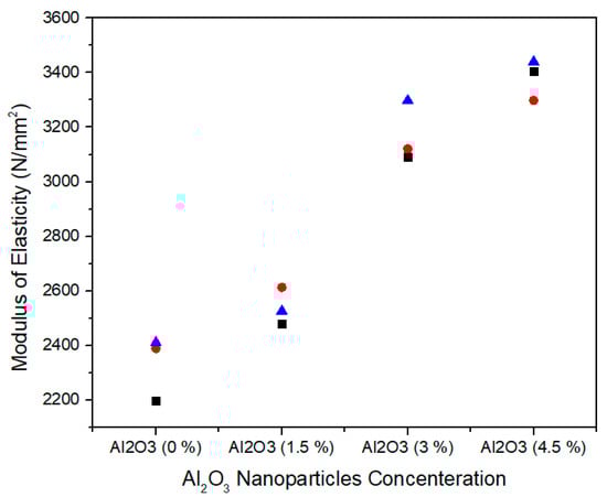 It can be noted that the modulus of elasticity value at 0% alumina nanoparticle in urea-formaldehyde resin in Table 4 is 2332.08 N/mm2. When it is compared with 1.5%, 3%, and 4.5% concentrations, the corresponding modulus of elasticity values increased by 8.17%, 25.70%, and 31% respectively and is also meet with EN-310 [37] standard values.