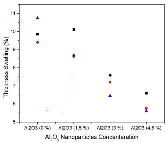 The physical properties such as density, thickness swelling and water absorption are summarized in Table 10. The samples were tested for 0%, 1.5%, 3%, and 4.5% concentration levels of alumina nanoparticles with three iterations of each sample and the average values were taken into consideration. Both thickness swelling and water absorption tests were performed for 24 h according to British Standard EN-317 1993 [38] and ASTM D570 [39] respectively.
