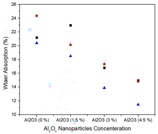 Water Absorption values of Al2O3-UF MDF for various treatments.