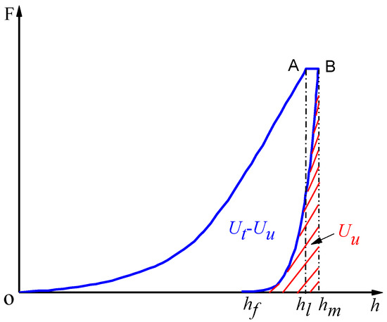 For some materials such as composite metal or heterogeneous media, there are some defects in the experimental analysis. Not all parameters such as E and H can be measured by a single indentation fracture test. In order to solve this problem, the change of energy during indentation is studied. According to the energy scaling relationship of indentation, the ratio of E/H in Equations (3) and (5) can be replaced with the ratio of total/unloading energy [30]. Figure 4 shows the schematic illustration of shale micro-indentation load–displacement curve.