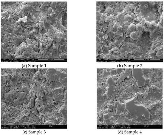 Nuclear magnetic resonance (NMR) was used to study the pore distribution of shale. Figure 5 presents the scanning electron microscopy (SEM) images of four samples. The bedding and micro-crack are well-developed. Clay and non-clay minerals can be observed directly. The surface structure of sample is compact, and flake clay minerals and insoluble residues can be seen. Non-clay minerals are evident, and authigenic carbonate minerals, pyrite, feldspar are developed on the surface. This microstructural characteristic of shale may lead to the concentration of tectonic stress or the intensification of microcracks after hydration, resulting in the fracture and spalling of the rock in the wellbore.