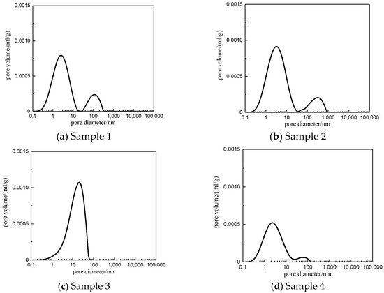 Figure 6. displays the pore size distribution of four samples. It is seen that sample 1 and 2 have, in order, similar pore distribution. The pore size of four samples is 0.05–120 nm. The left peak in Figure 6 is distributed symmetrically and has a large peak, which indicates the development of microporous to mesoporous samples.