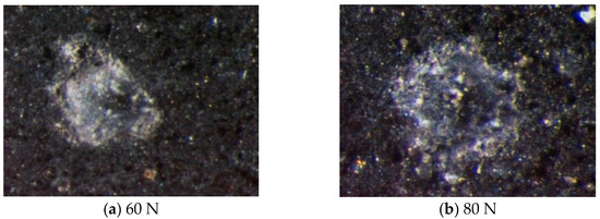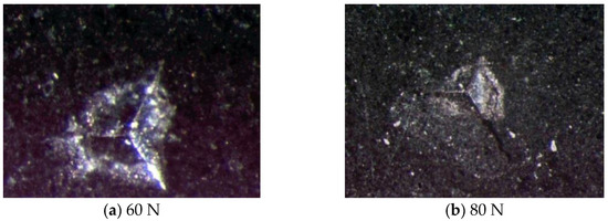 In order to get an accurate assessment, we also performed indentation by using Berkovich indenter. Maximum loads are 60 and 80 N. Figure 8 presents the typical micro-indentation of shale obtained by Berkovich indenter. It is seen that the similarity between Berkovich indenter and indentation is better than that of Vickers indenter. The surface crack appeared when the load reached the threshold of shale fracture. It is observed that surface radial crack began to develop at 60 N. The crack development is obvious when the maximum load is 80 N. According to the previous analysis (Section 4.1), the length of radial crack is the important parameter. It is clear that Berkovich indenter is suitable for shale fracture evaluation.