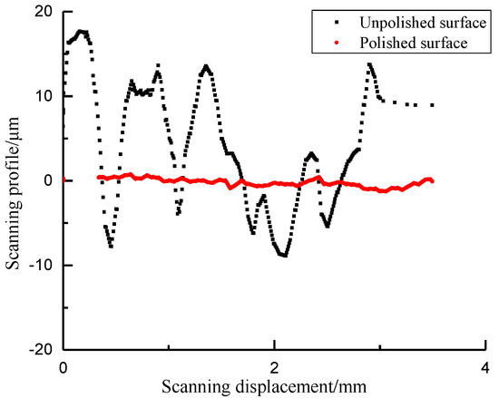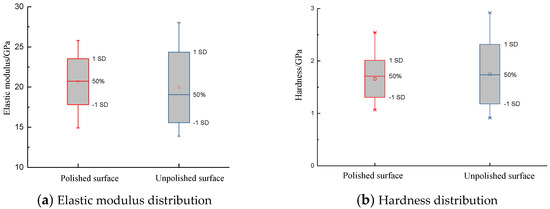 Shale is composed of granular minerals with a certain roughness on its surface. The surface roughness is related to the indentation displacement and contact area. If the characteristic length of the roughness is the same magnitude as the indentation displacement, the contact area obtained at the sink-in point of the shale surface is lower than the true value and higher than the true value at the pile-up point. Therefore, it is suggested that the displacement length of indentation test is no less than 20 times the surface roughness. It can be ensured that the uncertainty of indentation displacement caused by surface roughness is less than 5%. Figure 9 compares the results of surface scanning profile before and after mechanical polishing. The scan profile displacement of unpolished surface varies from −10 to 19 μm. Surface toughness has obvious influence on the elastic contact displacement. The scan contour displacement of polished surface decreases obviously, and the contact area function is less affected. Elastic modulus and hardness can be greatly affected by fluctuating displacement. In the experimental analysis, elastic modulus and hardness are important parameters to obtain fracture toughness. Figure 10 shows the distribution of elastic modulus and hardness before and after surface polishing of shale by micro-indentation test. The measured elastic modulus and hardness of the polished surface converge to those of the unpolished surface. It is necessary to polish the sample surface before indentation test.