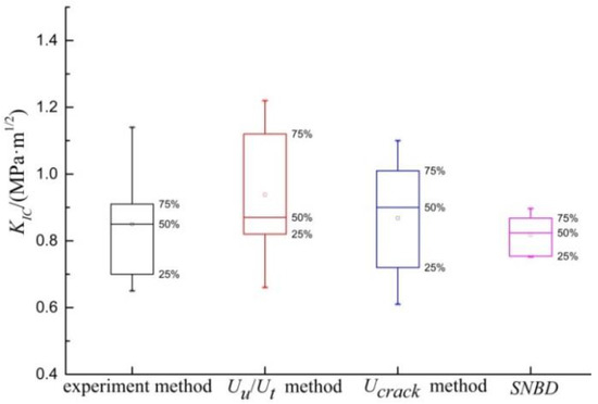 The results of straight-notched Brazilian disk (SNBD) show that the fracture toughness of shale at macro-scale is about 0.82 MPa·m1/2 [35]. In this paper, the SNBD results are considered as agreed truth values of shale fracture toughness. These agreed truth values are used to compare the reliability of the analysis micro-indentation test. The indentation load in the test is taken as 70 N. Figure 15 shows the fracture toughness distribution by micro-indentation experiment, total/unloading energy method, fracture energy method and SNBD. The KIC of experiment method is 0.65–1.14 MPa·m1/2, 0.86 MPa·m1/2 on average. The distribution deviation from 25–75% is less than 0.22. The KIC of Uu/Ut method is 0.66–1.22, 0.94 MPa·m1/2 on average. The distribution deviation from 25–75% is less than 0.32. The KIC of Ucrack method is 0.72–1.1, 0.87 MPa·m1/2 on average. The distribution deviation from 25–75% is less than 0.31. It is found that the average KIC of experiment method accord well with the SNBD results. When experimental parameters are not easy to obtain, energy method can be as a simplified approximate solution.