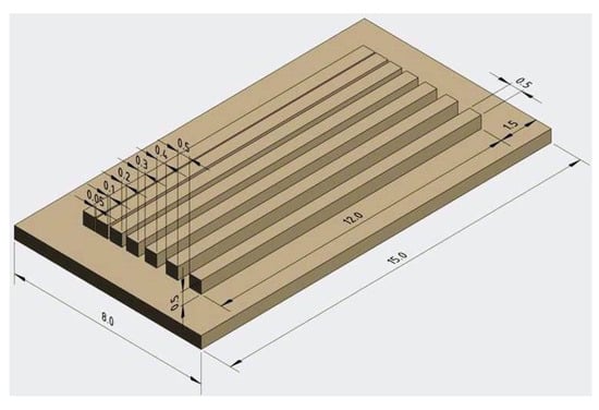 An excess of the unpolymerized slurry was removed using compressed air and a commercial cleaning solution LithaSol 20 from Lithoz GmbH (Vienna, Austria). To test the printing parameters settings, cuboidal specimens (5 mm × 5 mm × 1 mm) were fabricated. A plate with the bars separated by channels of the width 0.05 to 0.5 mm was shaped to test the possibility of microchannel fabrication using the UV-LCM device. This design is presented in Figure 1.