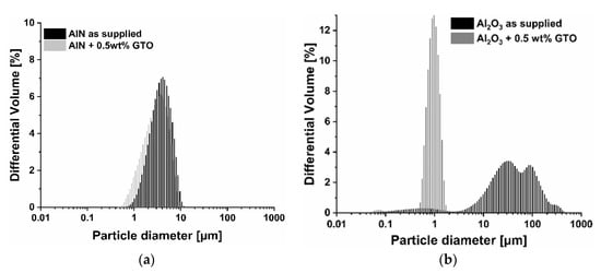 The evaluation on the effective dispersant concentration was presented in our previous study [29], using BYK-W 9010 and glycerol trioleate (GTO) as two dispersing agents. In the present study, GTO was used as the main dispersing agent and 0.5 wt % concentration was used to coat the powders and the resulting particle size distribution (PSD) was examined on LS 13 320 from Beckman Coulter (Krefeld, Germany). The PSD specimens were extracted directly from powder dispersions in MEK/EtOH, after mixing them for 24 h (so-called pre-treatment). All PSD measurements were performed in isopropyl alcohol and using Fraunhofer optical model.