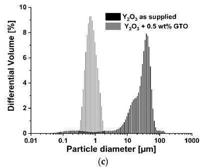 Particle size distribution of (a) AlN, (b) Al2O3, (c) Y2O3 treated with 0.5 wt % of GTO.