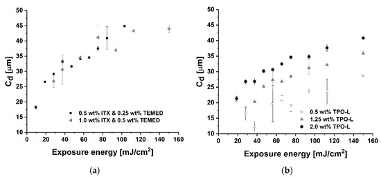 Cure depth in the function of exposure energy for slurries containing (a) ITX and TEMED, (b) TPO-L as a photoinitiator.