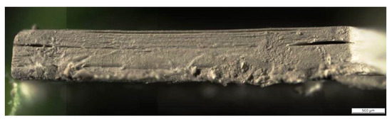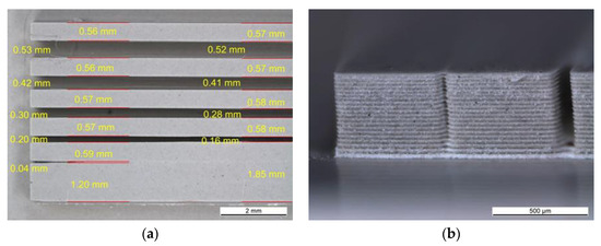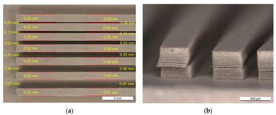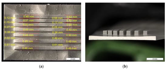 A structure called a plate with channels was obtained by using the same slurry as described above and the printing parameters PP-B. Despite low values of the cure depth, it was possible to fabricate that structure. Figure 7a shows the top view of one half of the plate with channels. The finest fabricated channel width was equal to 60 μm. In terms of the micro-heat exchanger fabrication, creating plenty of such channels would give an opportunity of increasing the surface area which would be in contact with the liquid, enhancing the heat transfer. Comparing the width of the physical object to those in the CAD model, an overgrowth of about 1.85% was observed. All the measured dimensions of the channel and bar widths are given in Figure 7a. The side view of the bars is given in Figure 7b. The photo revealed layer delamination as well as layer dislocation. Low cure depth values did not ensure sufficient bonding through the layers. Therefore, the adhesion forces between the cured layer and the vat’s surface could cause partial ripping off of a new layer from the preceding ones. Perhaps, low tilting speeds (5 steps∙s−1) had the benefit that the layers stuck together instead of completely separating from each other.