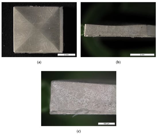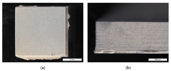 To improve the interface between the layers, the layer thickness printing parameter was decreased to 10 µm and AlN dispersion containing 0.5 wt % TPO-L was shaped applying the printing parameters PP-D (Table 1). Figure 8 shows photos of a fabricated cuboidal specimen; Figure 8a shows the top of the part and Figure 8b,c show the side of it. At the specimen’s top, the lines along its diagonals were observed as well as the brighter and shadowed areas. The location of those areas indicated that diagonal lines were the highest on the object’s top. Additionally, some dendrite-like patterns were observed next to diagonal lines. The side of the specimen (Figure 8b) was slightly bent towards its bottom surface (shown by the arrow). That was in a good correlation with the previous observations. In Figure 8c, some delamination was observed at the lower layers, close to the base of the specimen (which was in direct contact with the building platform). At the upper layers, no layer delamination was observed and the layer interface was not distinguishable. Decreasing the layer thickness printing parameter improved the interface between the layers.