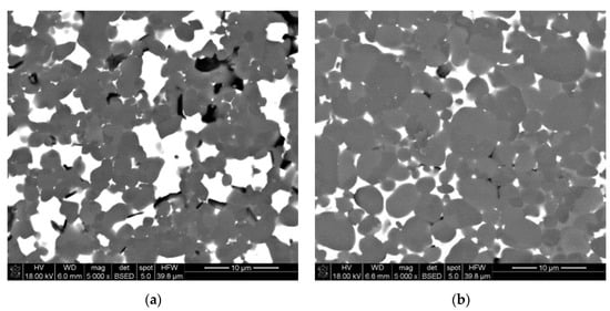 Three-dimensionally fabricated specimens had some micro-cracks after the debinding cycle. After sintering at 1800 °C for 1 h, the samples were polished, sputtered with carbon and imagined via SEM. In Figure 11a, the SEM image of the LCM-shaped sintered specimen is presented, and Figure 11b shows the image of the pressed sintered piece. In both cases, white areas corresponded to the liquid phase, dark grey areas were aluminum nitride grains and almost black areas could be pores remaining from the thermal treatment and/or defects caused by polishing, which were filled with another material, i.e., a sputtering layer material. In the case of both specimens, the liquid phase is not distributed uniformly. In Figure 11b, AlN grains with rounded grain boundaries, indicating their dissolution into the liquid phase, were not observed in the case of LCM-fabricated specimen.