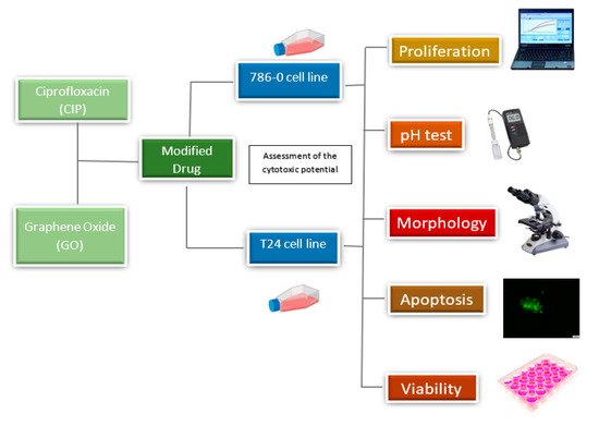 According to a recently released report by the International Agency for Research on Cancer from the World Health Organization (WHO), the global cancer burden was estimated at 18.1 million new cases and 9.6 million deaths in 2018 [1]. Among the genitourinary system cancers, renal cell carcinoma (RCC) and transitional cell carcinoma (TCC) are the ones which recently attracted the attention of oncologists and scientists due to insufficient therapy efficiency (high systematic toxicity), high mortality rates, and a constant increase in the number of patients diagnosed with such types of cancer [2]. Currently, most of the patients with these cancer types have been treated with chemotherapy, which is considered the gold standard treatment [3]. Unfortunately, its success is often hampered by multidrug resistance (MDR) [4], active removal of drugs from the cells [5], and poor bioavailability and non-specific targeting [5]. For this reason, oncologists have called for fundamental studies and new upstream technological innovations to respond sustainably, efficiently, and safely to current and future patients’ needs [6]. Furthermore, considering the occasional lack of efficiency of treatment methods such as traditional chemotherapy, radiotherapy, or surgery, the oncology society has demanded from scientists solutions in the form of the development of new materials which allow drug delivery with the final goal of maximizing therapeutic efficacy [7]. Recently, multiple studies have documented that modified-drug therapy is emerging as a promising approach for the treatment of cancer. Moreover, nowadays, scientists’ and technologists’ expanding knowledge concerning nanotechnology provides a unique opportunity for the combination of exceptional properties of nanoparticles and nanomaterials for precise introduction of the active compound into the tumor [8]. Inspired by a released review in the Nature publishing platform [9] concerning the outstanding properties of graphene-based smart materials, we unquestionably decided to follow the current research trends and to employ graphene oxide (GO) as a promising strategy to enhance the therapeutic index for ciprofloxacin (CIP) as an anticancer agent for genitourinary system treatment. CIP is an organic compound, included in the second generation of fluoroquinolones, which is characterized by good tissue penetration and favorable pharmacokinetic parameters [10]. For a long time, ciprofloxacin was thought to affect only bacterial cells [10,11,12], but currently, it is widely known that this drug can significantly reduce the viability of human cancer cells [13,14,15]. We believe that an innovative transformation of traditional CIP to GO-CIP nanoplatform could introduce a new treatment perspective with a significant effect on the reduction of side effects in normal cells, enhancement of their anticancer activity as well as the increase of their stability. Indeed, GO possesses the ability to accumulate in tissues, including cancer tissues [16,17], and due to its affinity to lower pH levels [18], GO-drug modified nanoplatforms could increase the chances of targeting a specific region of interest, being the cancer tumor, while decreasing systemic toxicity.