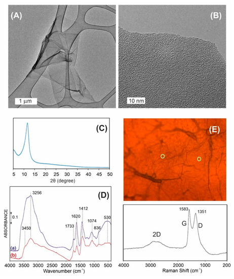 GO characterization was performed with a combination of proven and innovative techniques such as high-resolution transmission electron microscopy (HRTEM—Figure 2A,B), XRD (Figure 2C), FTIR (Figure 2D), and Raman spectroscopy (Figure 2E). The results proved that GO forms large, single-layered, turbostratic structures.