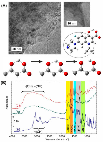 The most important spectral changes are observed in the C=O stretching region. While the pristine CIP forms internal salts, causing the disappearance of carbonyl bands, due to strong H-bonding, in the complex with GO, typical carboxyl and carbonyl functionalities are rebuilt (see scheme in Figure 3). This can be observed when the N-containing part of CIP molecules is involved in interactions with the GO support. The lack of v(NH) and v(CH) in the spectra (b) and (c) confirms this statement. Moreover, the pyridinic fragment of CIP was red-shifted from 1503 down to 1455 cm−1. This observation means that basic sites of CIP interact strongly with GO acidic functionalities. Nevertheless, in the vibrational spectra of related compounds, the bands due to C-F stretching vibrations may be found over a wide frequency range 1360–1000 cm−1 [23], since the vibration is easily affected by adjacent atoms and/or groups. In the present study, the FTIR bands observed at 1316 cm−1 have been assigned to the C-F stretching mode of vibration.
