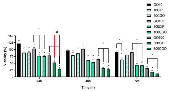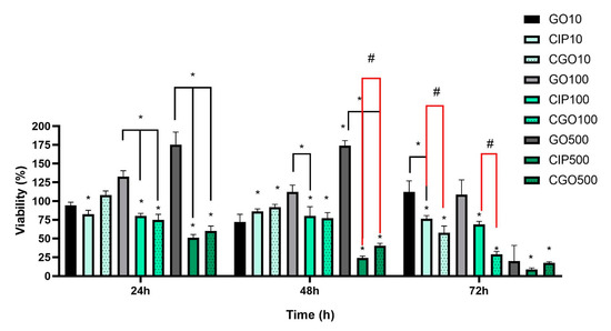 All viability results acquired via MTT assay are shown as means (±SD) of % viabilities of a given group compared to controls at specific exposition times. Statistically significant changes in viability of T24 cells were observed as soon as 24 h after exposition with all CIP and CGO concentrations. After 48 and 72 h, a further decrease in viability was observed with all tested solutions. At 24 h and 48 h, a statistically significant difference compared to control in viability was observed between CIP and CGO, of which the difference between 500 CIP and 500 CGO was the biggest (52.09 ± 3.64 vs. 29.03 ± 5.83) (Figure 4). For the T24 cell line, the results of the assay show strong cytotoxic activity of both ciprofloxacin and GO-modified ciprofloxacin. All tested concentrations of CIP and CGO caused a statistically significant decrease in cell viability compared to the control. However, for concentrations in the range of 100–500 μg/mL, a decrease was maintained for a duration of 72 h (Figure 4). A statistically significant difference in viability was observed with the addition of GO, at 500 μg/mL at 24, 48, 72 h. A statistical dependence was demonstrated between the control of graphene oxide at individual concentrations and the corresponding drug concentrations.