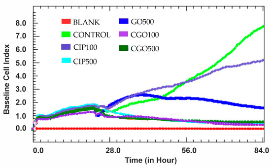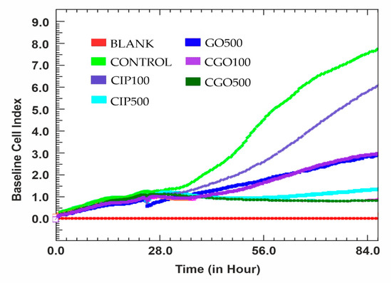There is no significant difference between CGO and CIP at concentrations of 100 and 500 μM (Figure 7). The logarithmic growth phase is not observed in these concentrations. The highest cytotoxicity is with ciprofloxacin at a concentration of 1000 μM. In control cells of the 786-0 line, the logarithmic growth phase lasts up to 84 h of measurement. For the control of graphene oxide at 500 μg/mL, from the 40th hour of the experiment, there was a slow decrease in cell viability, visible until the end of the study.