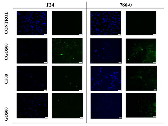Cells of the 786-0 and T24 lines showing the results of the active caspase 3/7 assay. DAPI-stained cell nucleus, FITC—cells that underwent apoptosis. The photos were taken with the CKX53 FN Olympus fluorescence microscope, Japan, and the VC90 4 K Olympus camera, Japan. For the test samples with graphene oxide, autofluorescence of the compound itself was observed, which significantly hindered the observation of apoptotic cells. Scale bar is 50 µm.