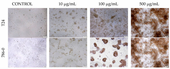 To ensure sterility and safety, all procedures regarding cell culture were carried out using a class II laminar flow cabinet (Bio II Advance—Telstar, Barcelona, Spain). Human bladder carcinoma line T24 (CLS Cell Lines Service) were cultured using DMEM/Ham’s F-12 (Corning, New York, NY, USA) while the human renal carcinoma 786-0 (American Type Culture Collection) and human renal carcinoma cell line 786-0 (American Type Culture Collection) were cultured using RPMI1640 (Corning, New York, NY, USA). Both media listed above were supplemented with 10% FBS (Corning, New York, NY, USA), 5 μg/mL amphotericin B, 100 U/mL penicillin, and 100 μg/mL streptomycin (Corning, New York, NY, USA). Cells were cultured at 37 °C in a humidified incubator under 5% of medical grade CO2.
