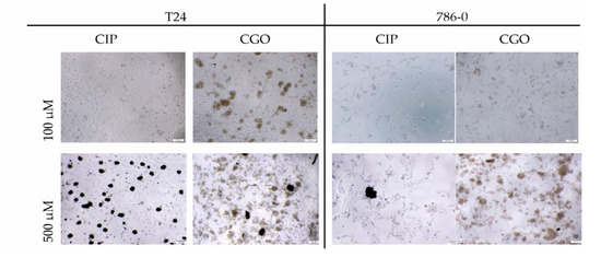 Morphological analysis of T24 and 786-0 cell lines after the addition of tested solutions shows a clear trend and points towards dose-dependent toxicity. The compound concentration range of 100–500 μM has proven to cause significant morphological aberrations visible at both modified and unmodified ciprofloxacin. Phase contrast microscopy proved detectable granularities around the nucleus, signs of cell detachment from the growth surface and severe cytoplasmic vacuolation (Figure 9). In the case of the control group (GO), in the 10–500 μg/mL concentration range, large dark aggregates of GO residue were noticeable and visibly were limiting the available cell growth area (Figure 9).