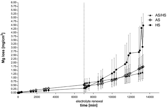 Focusing on the rate after the fifth day, the corrosion rate in Hank’s solution exceeds the others with 0.6675 ± 0.2766 mg/(cm2·day) as observed previously in the kinetics. The difference between alloys, which were only immersed into Hank’s solution and alloys in AS/HS is significant (p = 0.0272), whereas the latter alloys show the lowest corrosion rate of all.