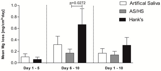 10-day-corrosion curves of Mg-0.6Ca-0.8Zn wt.% in Hank’s balanced solution, artificial saliva as well as AS/HS (5 days artificial saliva, 5 days Hank’s balanced solution) Electrolyte contents of the control groups were renewed after 5 days. Each experiment was repeated at least 3 times. Values are shown as means.
