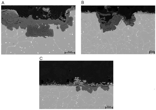 Scanning electron micrographs of the microstructure of Mg-0.6Ca-0.8 wt.% Zn Alloys for (A) 10 days in Hank’s solution, (B) 10 days in artificial saliva or (C) in AS/HS (5 days artificial saliva, 5 days Hank’s balanced solution).