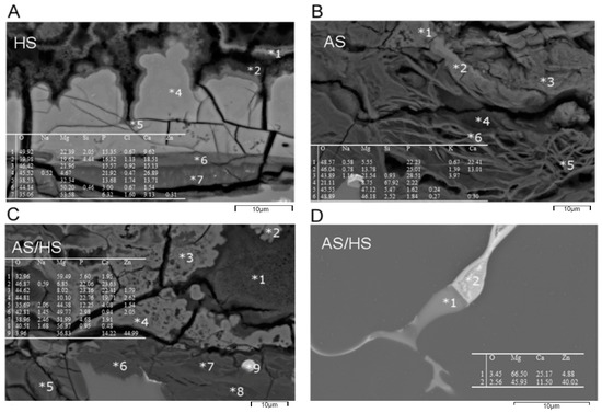 Cross-sectional scanning electron micrograph with EDX Analysis of Mg-0.6Ca-0.8 wt.% Zn Alloys for (A) 10 days in Hank’s solution, (B) 10 days in artificial saliva or (C,D) in AS/HS (5 days artificial saliva, 5 days Hank’s balanced solution).