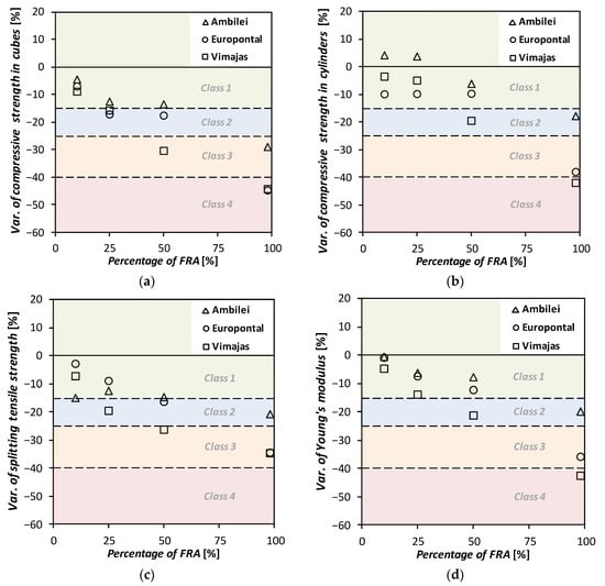 Variation of compressive strength in (a) cubes and (b) cylinders, (c) of splitting tensile strength and (d) of Young’s modulus of concrete made with FRA, relative to the reference concrete.