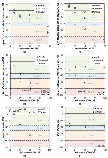 As seen in Table 4 and Table 5, the incorporation ratios of one of the three types of FRA included in class 1 should be used only when the production of a concrete with a decrease in mechanical properties lower than 15% and a decrease in the remaining properties lower than 35%, compared to a standard (reference) concrete, is acceptable. The fine RA incorporation ratios included in class 2 should only be made when the production of concrete is acceptable with a decrease in mechanical performance below 25% and a decrease in the remaining properties below 50%, and so on. However, it should be stressed that the contents of fine RA within class 4 are only for filling and regularization concrete applications.