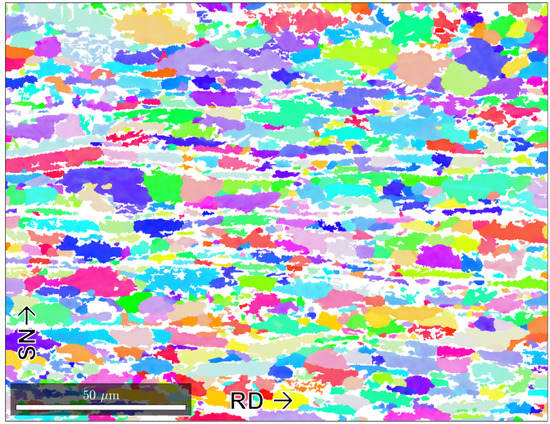 In this study only one direction in space was chosen for the analysis, since strong differences between different directions might apply, which increases the difficulty and complexity for the appropriate fitting of the input data. The rolling direction (RD)—sheet normal (SN) plane was chosen, since it shows the elongation of the grains and therefore more microstructural parameters that need to be present in the RVE.