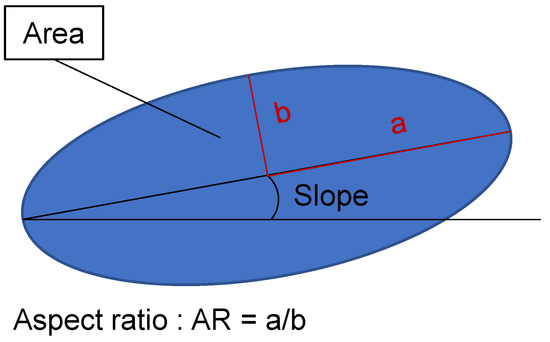 All of the above mentioned parameters are obtained by using the MATLAB (Matlab R2019a—The Mathworks Inc., Natick, MA, USA) toolbox MTEX (MTEX version 5.3.0) [21]. This toolbox is able to analyse a lot of different characteristics of the microstructure, chief among which are the grain size, the aspect ratio (AR), and the slope, as well as the possible crystallographic orientation. Probably the most important aspect is the grains area, since the grain size also strongly influences mechanical properties. Apart form the size, the slope is an important factor and describes the tilt of a grain towards the x-axis of the EBSD picture taken, in this case the rolling direction (RD), where angles close to 0 or 180 means an elongation of the grain along the rolling direction. The last parameter is the AR, the ratio of the two half-axis a and b. A high AR stands for a bigger elongation, while an AR of 1 describes a circle. Both, the AR and slope influence the strain and stress concentration and distribution in the microstructure and are thus important to be depicted in the RVE. Apart from these geometrical factors, there are further material specific characteristics. The first is the grain orientation this is especially important when a texture is present in the material. Next are the different phases, in the case of DP800, ferrite and martensite. Additionally neighbourhood relations between the grains might be taken into account. All of the parameters mentioned above can be gathered from the data generated by the EBSD measurement. From this measurement, a list of grains and their corresponding characteristics can be obtained that is afterwards used for further analysis.