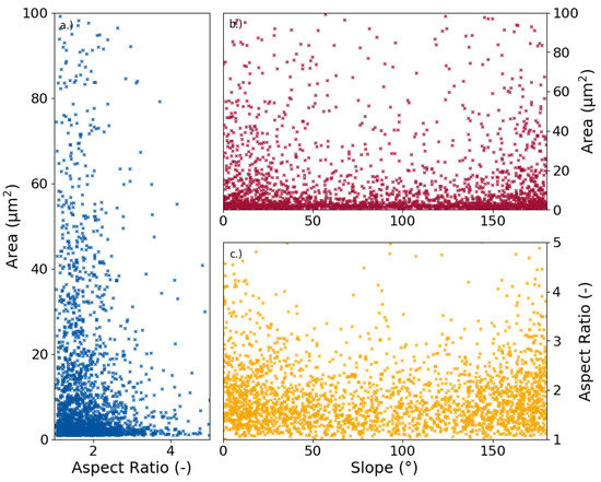 Scatter plots of the dependencies between the three main grain parameters, grain size and aspect ratio (a), grain size and slope (b), and aspect ratio and slope (c).