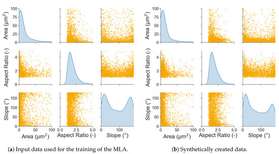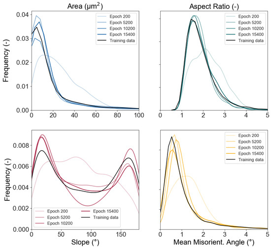 Here, a significant improvement of the fit is visible, where epoch 200 is an unoptimised guess, while the network improves over time with the training and is able to represent the distributions of the input parameters at the best fit epoch accurately. From the trained generator, network data can then be extracted, which is usable as input for e.g., RVE creation. The output of the NN follows the same format of the input. This means that every parameter contained in the input data will be present in the output created by the MLA. Since the focus is the creation of input data that geometrically represents a grain (Figure 2), the main features to compare are area, aspect ration, and slope. In Figure 7, pairplots of both the input data and synthetically generated output data are presented. On the diagonal, the KDE distributions are shown, while the other graphs show the respective parameters plotted against each other. From these pictures the compliance between real and synthetic grain data appears to be excellent.