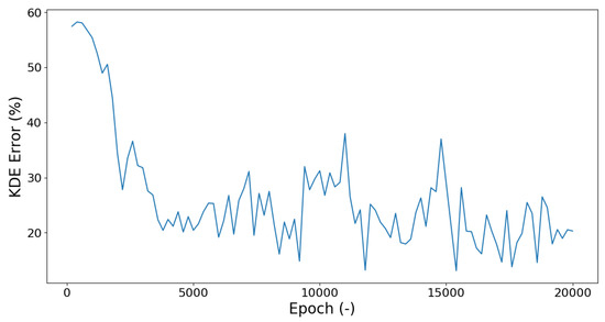 where is the input data KDE and x is the artificial output data KDE. Due to this analysis, the lowest deviation between the KDE can be determined. In this case, the best fit was determined to be Epoch 15,400 which is the lowest point in the curve with an error margin of about 5%.