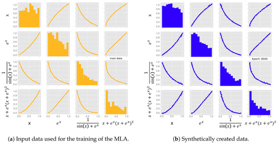 where x was generated from a uniform distribution. The other functions were arbitrarily chosen, with the criteria being that they all need to be dependent amongst each other. In this case Equation (2) is dependent on Equation (1), while (3) and (4) are dependent on both, (1) and (2). Thus all values were interconnected and the implemented MLA was trained on this data set. The results presented in Figure 9 show that the MLA is able to reproduce the input data very accurately. Both the distribution of each specific equation and the interdependencies as well show no significant deviation. It can therefore be assumed that the implemented MLA is capable of representing any interdependencies that are present in the input data and it can thus be assumed that the dependencies of the microstructure are represented by the MLA.